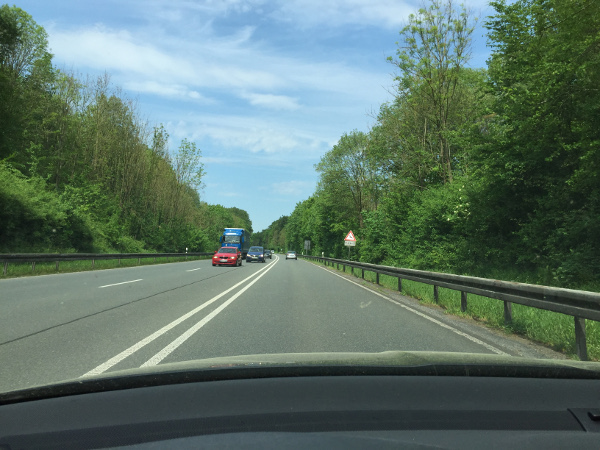 The fieldtest was conducted on 13 May 2016, near Paderborn, Germany. We used ath9k-based WiFi cards with a recent Linux kernel, supporting IEEE 802.11p OCB mode to send BPSK 1/2 and QPSK 1/2 frames with sizes of 200 byte, 500 byte, and 800 byte on channel 178 (5.89 GHz). The receiver was an Ettus Research N210 with an CBX daughterboard. Both sender and receiver used 6dBi dipol antennas and were equipped with NEO-7N GPS devices from u-blox.
